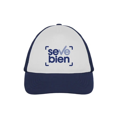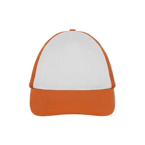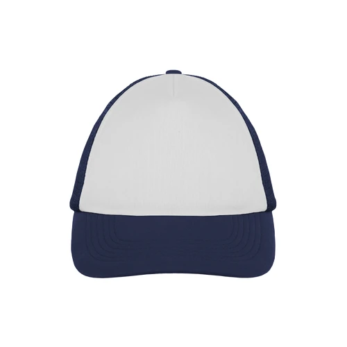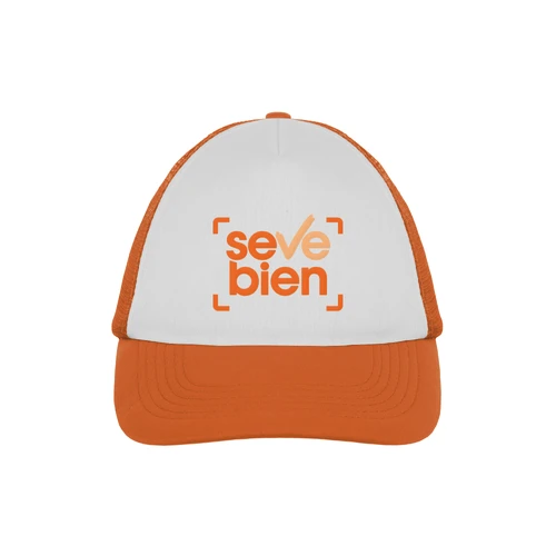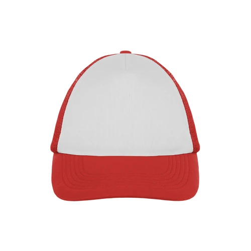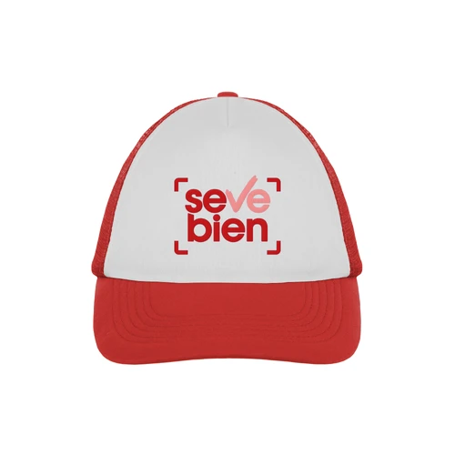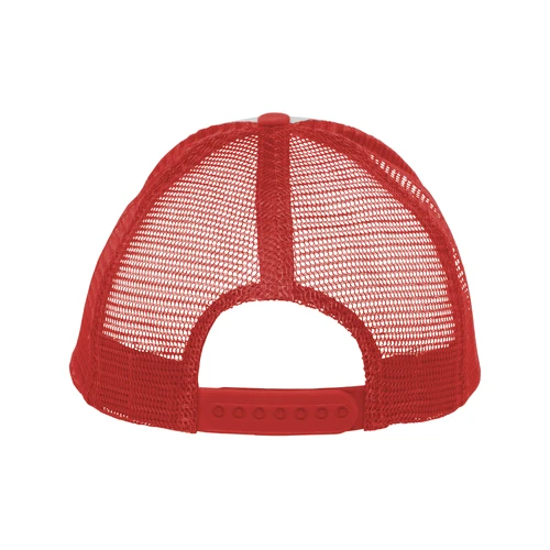Ancho de base 18 cm. x alto 16 cm. Poliéster. Gorra trucker 5 gajos. Frente de color blanco. Parte trasera con tela red de color. Ajuste con broche plástico. Seis costuras 17,5 x 7,5 cm.