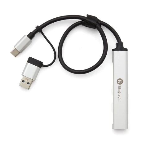 Hub con 3 puertos USB A y uno TIPO C. Puerto USB A / USB C. Es el accesorio perfecto para ahorrar espacio en tu escritorio y ampliar la conectividad de sus dispositivos. Su tamaño permite transportarlo con facilidad. Kingtech.