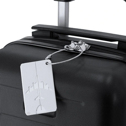 Original identificador de maletas con diseño de avión en resistente Aluminio Reciclado. Con cinta de acople en acero inoxidable con sistema de cierra en rosca y tarjeta de identificación en inglés con los siguientes campos impresos; Addres, Tel, Name, E-mail. Logo AL Recycled grabado por láser.