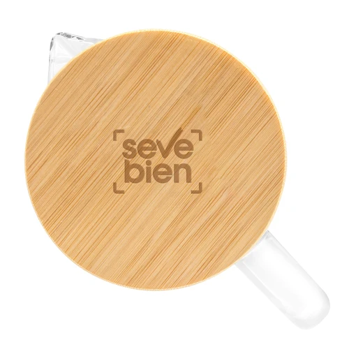 Ø 8,8 x 22,8 cm. Capacidad 1100 ml. Vidrio de borosilicato y bambú. Jarra con pico vertedor y asa de vidrio de borosilicato. Tapa de bambú y acero inoxidable 304 con anillo de silicona antiderrame. Presentación en caja de regalo kraft.