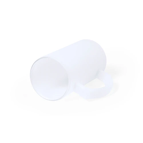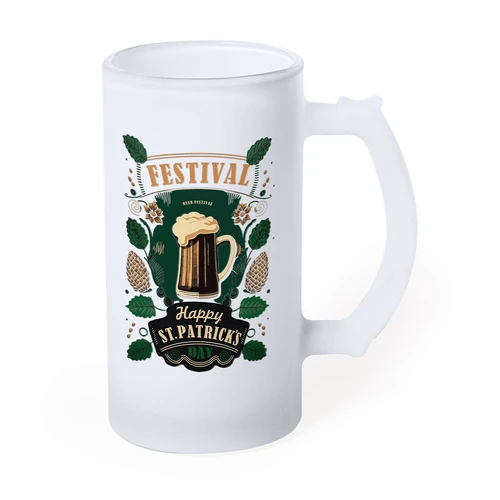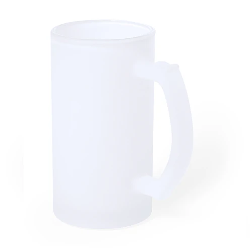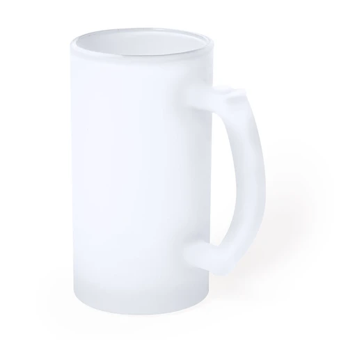 Jarra de cristal de acabado mate. De 500 ml de capacidad y con cómoda asa. Especialmente diseñada para la sublimación. Apta para microondas y presentada en caja individual kraft.