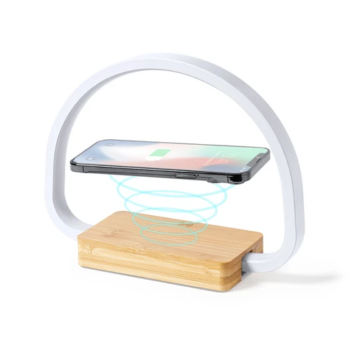 Lámpara cargador de diseño eco. Fabricada en bambú procedente de cortes naturales y con base antideslizante. Cargador inalámbrico 10W integrado. Incluye 52 LEDs y 3 posiciones de iluminación (cálida, fría y media), con intensidad de luz regulable. Compatible con dispositivos móviles de carga inalámbrica y conexión USB. Incluye cable cargador Tipo C y viene presentada en una atractiva caja de diseño eco. Disponible manual de instrucciones en español e inglés.