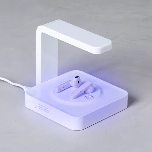 Lámpara esterilizadora de luz ultravioleta tipo C con cargador inalámbrico integrado para smartphone. Especialmente diseñada para la eliminación de microorganismos y bacterias en objetos de uso cotidiano como el smartphone, llaves, gafas, mascarilla, auriculares, smartwatch… Fabricada en resistente material ABS de acabado brillante y presentada en atractiva caja individual de diseño. Fácil de usar, basta con situar el objeto a esterilizar en la base de la lámpara. Potencia de salida 2,5W y longitud de onda de 254 nm. Salida USB de 1000 mA, con función de carga rápida 10W y cable micro USB incluido a juego de 1 metro de largo. Tiempo de esterilización de 15 y 25 minutos con función autoapagado. Disponible manual de usuario en español e inglés. Disponible certificación CE, RoHS y de efectividad germicida. Para un uso adecuado del producto, evitar el contacto con la piel y los ojos.