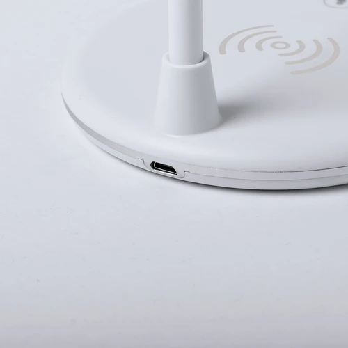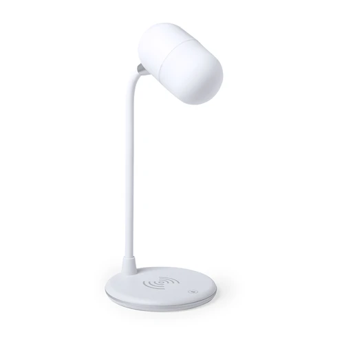 Lámpara multifunción todo en uno en acabado blanco, con altavoz Bluetooth 4.2 de 3W de potencia y cargador inalámbrico integrados. 14 LEDs y 3 posiciones de iluminación (cálida, fría y media), ajustable en altura. Compatible con dispositivos móviles de carga inalámbrica, con cable cargador micro USB y viene presentada en una atractiva caja de diseño.