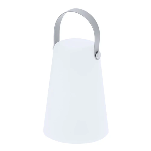 Lámpara en PE de color blanco. Incluye asa superior de suave silicona en tono gris, que facilita su transporte y añade un toque moderno al diseño. Equipada con 4 LEDs , proporciona una luz uniforme y eficiente, tanto para interiores como exteriores. Funciona con 3 pilas AA (no incluidas). Dispone de botón de encendido/apagado.
