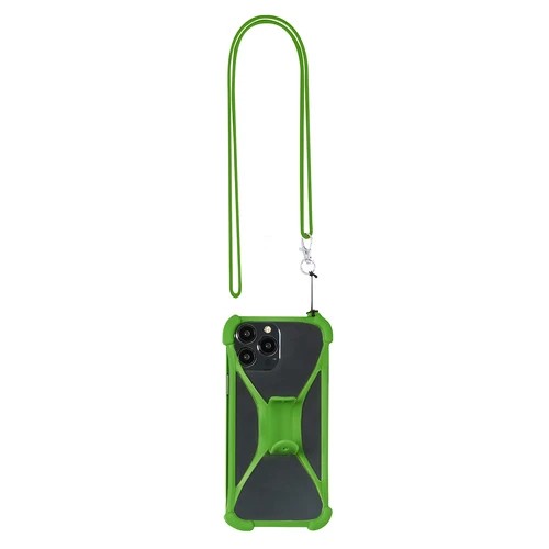 Práctico lanyard fabricado en resistente silicona. Incluye un accesorio para el móvil a juego, reforzado en las esquinas y con un soporte desplegable en la parte posterior. Con mosquetón metálico giratorio y disponible en variada gama de colores.