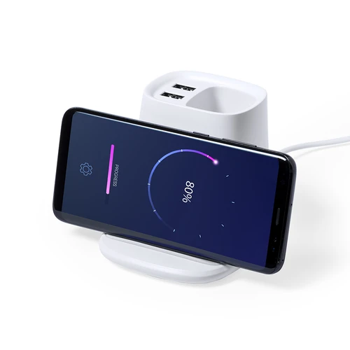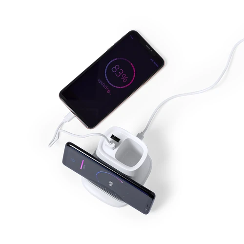Lapicero multifunción 4 en 1, fabricado en resistente material ABS de color blanco. Con funciones lapicero, soporte para smartphone, cargador inalámbrico 5W y 2 salidas USB de 2.000 mA. Puerto USB inferior, apto para transferencia de datos. Compatible con smartphones con tecnología de carga inalámbrica. Incluye cable tipo C de 1 metro de largo y viene presentado en atractiva caja de diseño. Disponible manual de instrucciones en español e inglés.