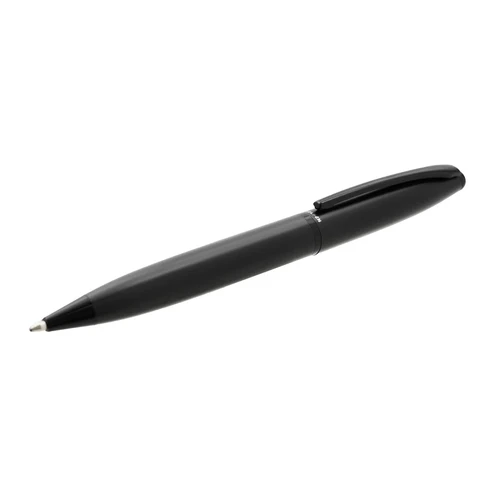 Lapiz de cuerpo metálico en acero con detalles en negro mate. Cuenta con tinta azul y apertura con medio giro. Medidas: 13,8 x 1,25 cm.