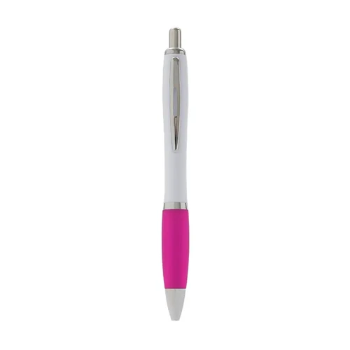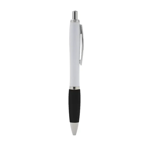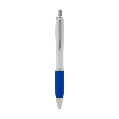 Bolígrafo con cuerpo curvo plástico en acabado blanco. Cuenta con grip de goma de color, clip y botón metálico, mecanismo retráctil y tinta azul.