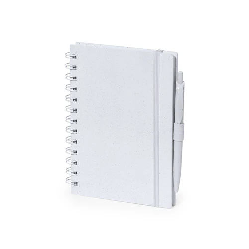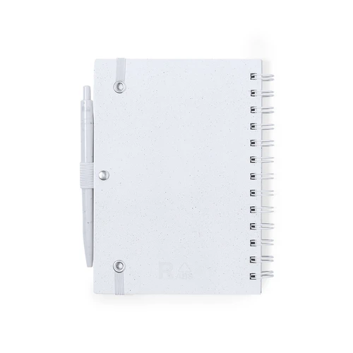 Set de libreta y bolígrafo. Libreta de anillas con tapas rígidas fabricadas en RABS y bolígrafo a juego. De tamaño A5, con elástico de cierre elegante disponible en amplia variedad de colores. Interior con 70 hojas blancas con disposición a una raya. Bolígrafo de mecanismo pulsador en RABS con tinta azul. Incluyen distintivo RABS. Presentado en bolsa individual reciclada.