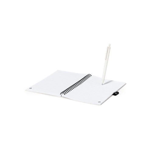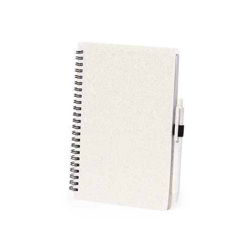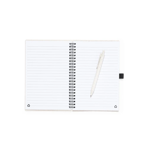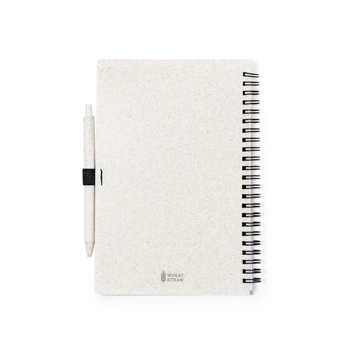 Set de libreta y bolígrafo. Libreta de anillas con tapas en caña de trigo y soporte para el bolígrafo. De 80 hojas con diseño eco y disposición a una raya. Bolígrafo de mecanismo pulsador, con cuerpo en caña de trigo y tinta azul. Con distintivo Wheat Straw. Presentado en bolsa individual reciclada.Elaborado con elementos vegetales para así fomentar la utilización de materias primas naturales y reducir las emisiones contaminantes.