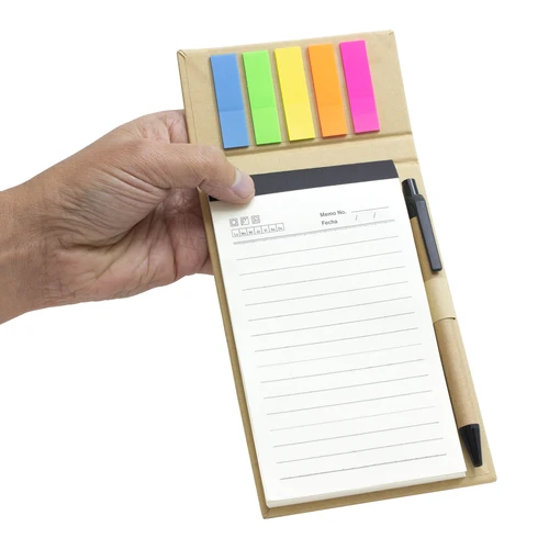 Tu aliada perfecta para organizarte Libreta anotador múltiples funciones. El kit contiene: un bloc de 70 hojas rayadas en obra ahuesado de 70g de 9 x 15 cm. impresos con fecha y día de la semana, bolígrafo retráctil tinta negra con cuerpo de cartón, pulsador, clip y puntera en plástico color negro, y 5 blocs de 25 tiras plásticas autoadhesivas de 4,4 x 1,2 cm en colores azul, verde, amarillo, naranja y rosa.Medidas: 15,5 x 10,5 cm. (cerrado) y 15,5 x 22,3 cm (abierto).