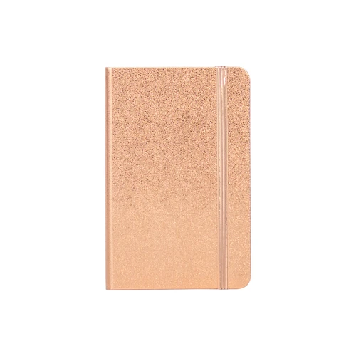 Libreta tamaño A6, con cubierta de cartón piedra forrada en PU color cobre de 1.5mm de espesor, interior 80 hojas amarillas lineadas de 80 gsm. Incluye banda elástica y huincha separador de hojas al tono. Presentación individual en bolsa de polipropileno translúcido.