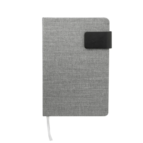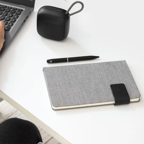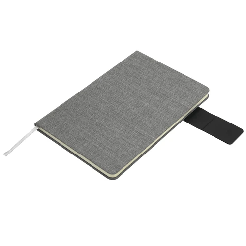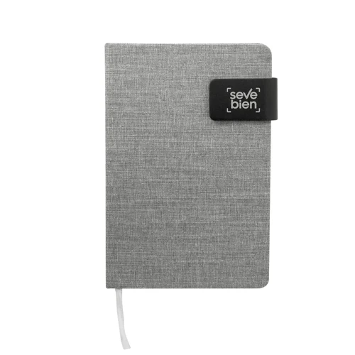 Diseño ejecutivo hecho con materiales recicladosLibreta. Tapa de cartón de 1,8 mm recubierta en RPET color gris con tira de poliuretano color negro con cierre magnético. Interior de 80 hojas rayadas en papel obra crema de 70g. Encuadernación cosido. Incluye cinta señaladora del color de la tapa. Medidas: 14 x 21 x 1,2 cm.