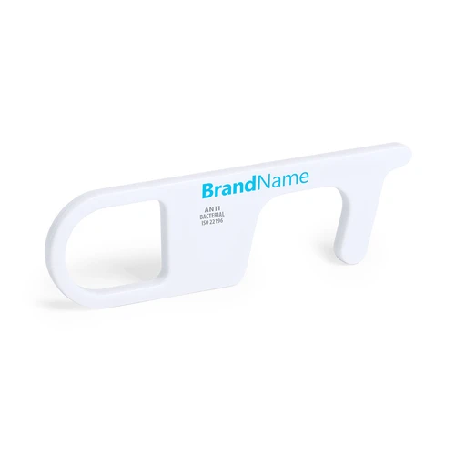 Llavero higiénico antibacteriano y anti-contacto, fabricado en resistente ABS de acabado sólido. Especialmente diseñado para evitar tocar con las manos superficies de uso común (picaportes de puertas, interruptores, grifos de uso público, cajeros automáticos...). Con cómodo troquel para el dedo y presentado en bolsita individual. Recomendado para marcaje en tampografía.Los productos con tratamientos antibacterianos son capaces de reducir drásticamente las cargas bacterianas presentes en las superficies de los materiales, gracias a la incorporación de agentes microbianos permanentes estáticos, con alta efectividad para inhibir y prevenir la contaminación bacteriana.Artículo de acuerdo al estándar ISO 22196, que determina la actividad antibacteriana en materiales plásticos y superficies no porosas, lo que permite conocer la efectividad de inhibición microbiana que tienen los aditivos sobre los objetos tratados mediante una evaluación cuantitativa.