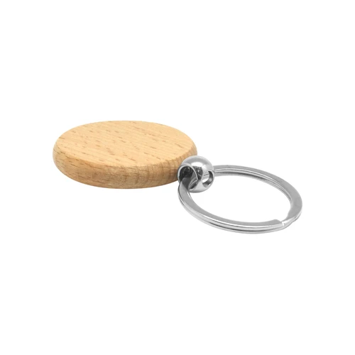 Ø 3,1 x 0,5 cm. (La medida no incluye el aro). Madera. Llavero redondo con aro metálico.