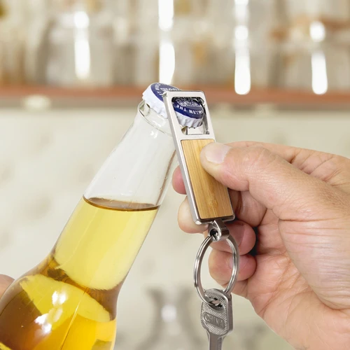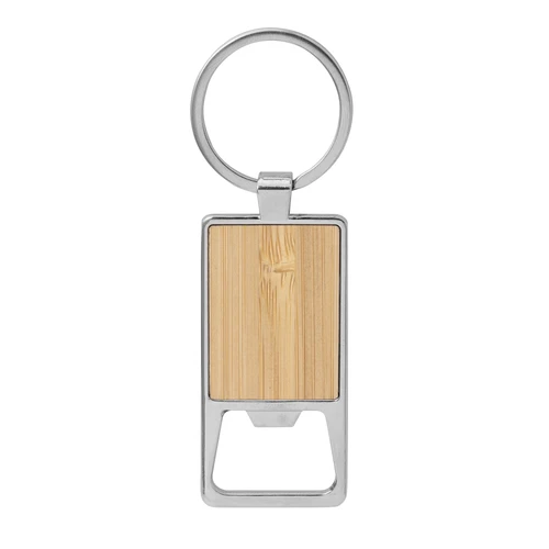 Funcionalidad y estilo.Llavero con destapador abre botellas. Estructura metálica con aleación de zinc con acabado brillante y panel frontal de bambú barnizadoMedidas: 6 x 3,2 x 3,5 cm.