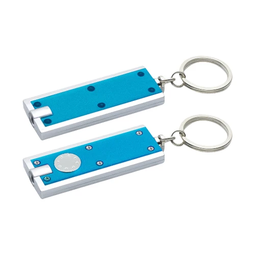 Llavero-Linterna de 1 LED, con cuerpo plástico frozen y botón pulsador plateado. Presentación en cajita plateada.