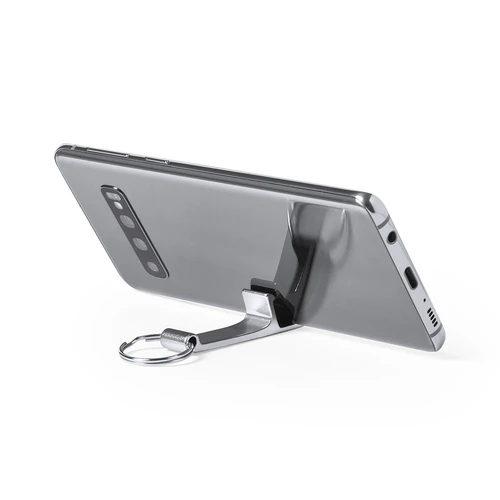 Llavero soporte para smartphone y tablet fabricado en aluminio de acabado mate, especialmente diseñado para marcaje en láser. Presentación individual en bolsita autocierre.