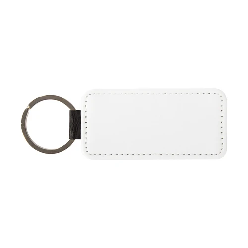 Llavero rectangular de PU blanco para sublimación. Reverso capa PU negro con brillo (no sublimable). Argolla de Acero inoxidable.
