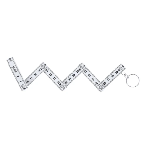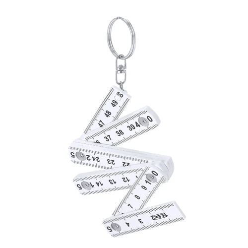 Llavero regla plegable de 50 cm en resistente ABS con anilla metálica giratoria. Escala en centímetros de color negro visible por ambas caras. Con posiciones ajustables a 90º, 180º y 270º para mayor versatilidad.