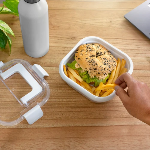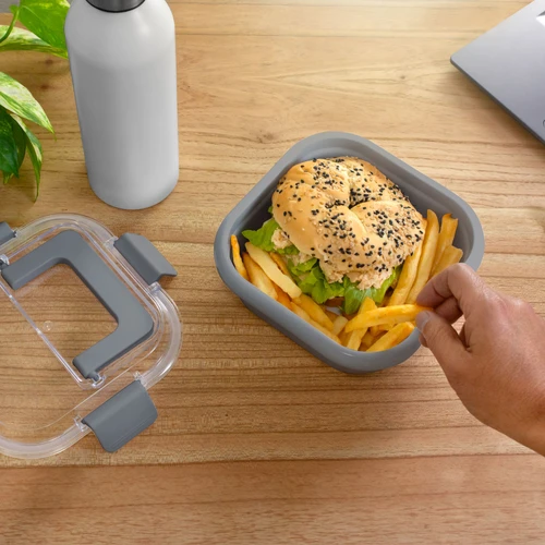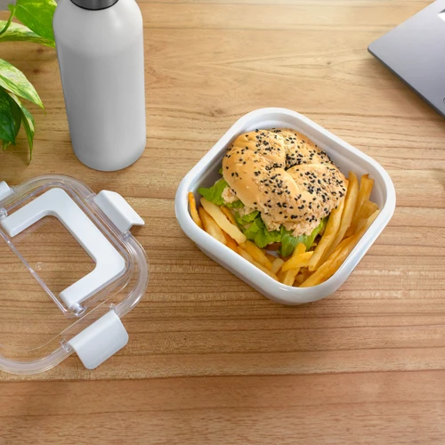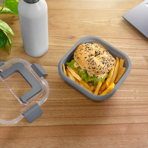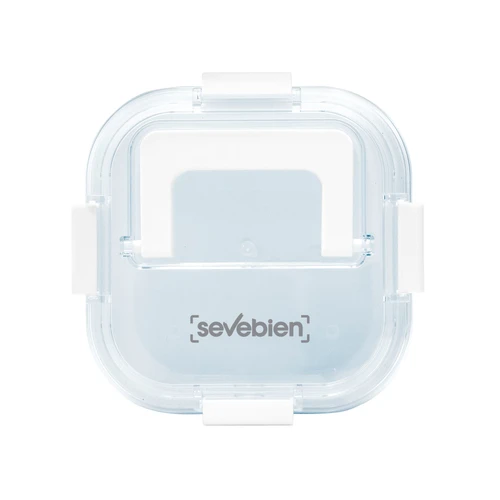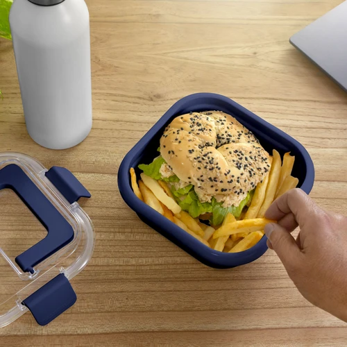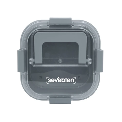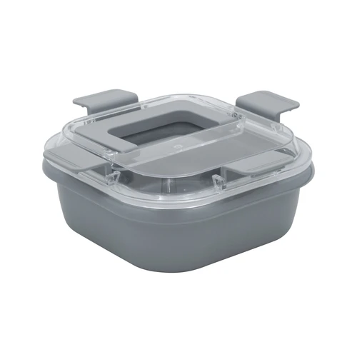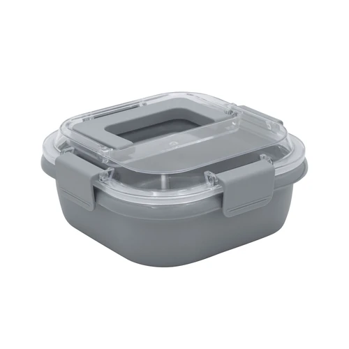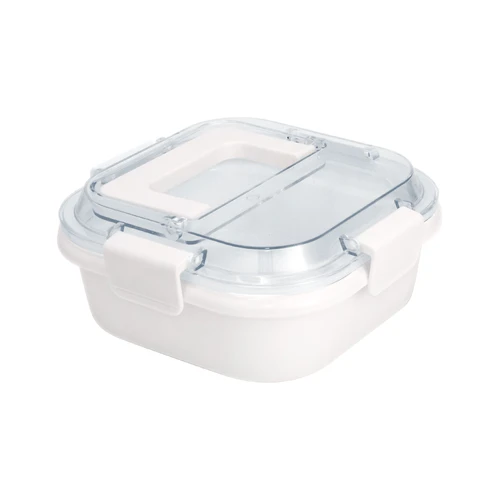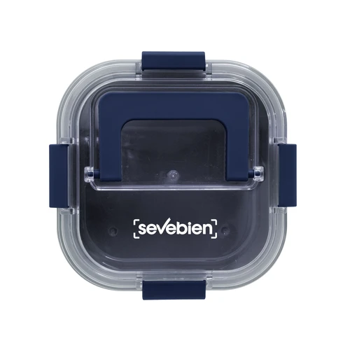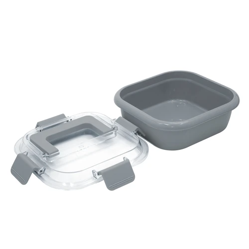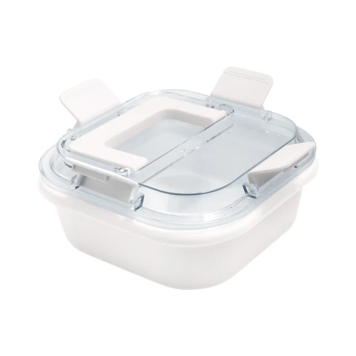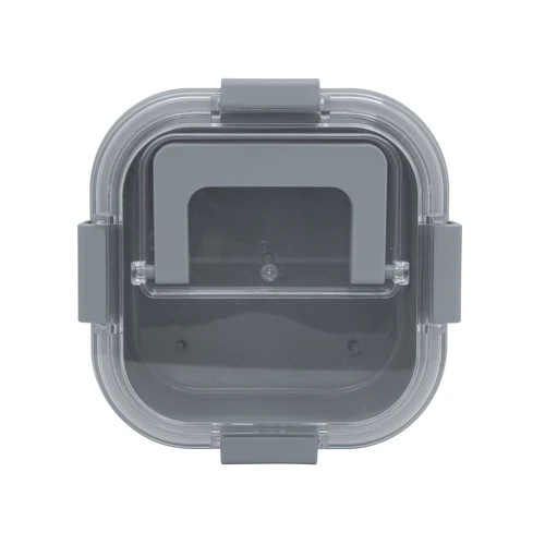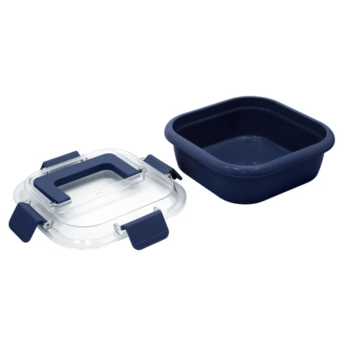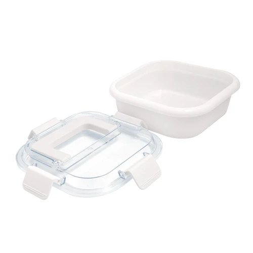 17,8 x 17,8 x 7,6 cm. Capacidad 1 litro. Plástico Polipropileno. Contenedor de alimentos. Tapa translúcida con cuatro clips de cierre hermético y asa para trasladar cómodamente. Clips y asa del mismo color que el recipiente.