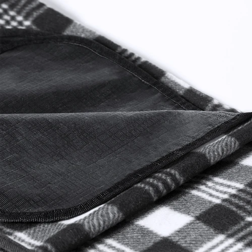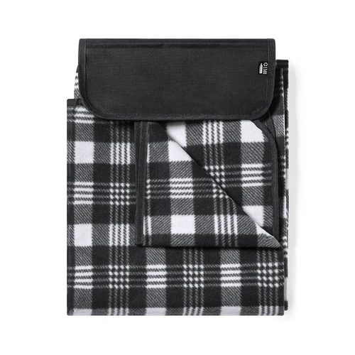 Manta de picnic de calidad premium, fabricada en poliéster RPET de 160g/m2, elaborado a partir de plástico reciclado para así fomentar la reutilización de residuos plásticos y contribuir a la sostenibilidad del planeta. Medidas 120x150cm, con lado para sentarse en patrón tartán bicolor de suave tacto. Lado en contacto con el suelo en resistente PEVA. De fácil plegado y de tamaño compacto, incluye asa de transporte y solapa con cierre de velcro, con distintivo RPET en etiqueta.