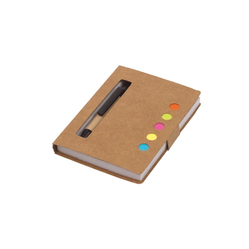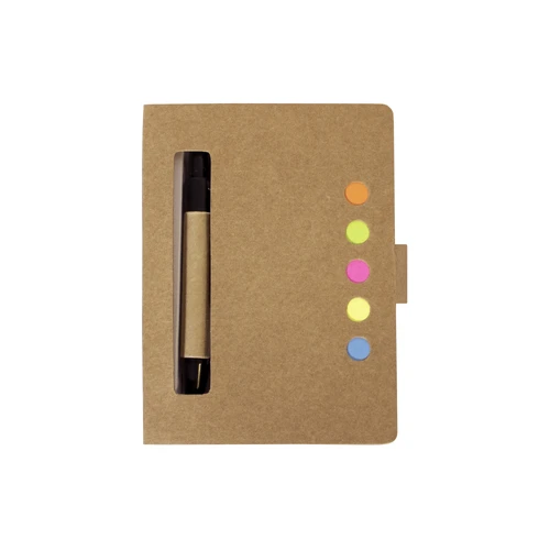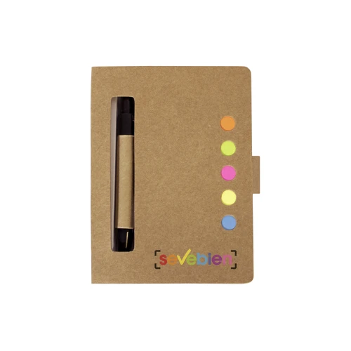 10,5 x 7,8 x 1,1 cm. Cartón. Material reciclado. 80 hojas lisas blancas. 5 blocs autoadhesivos rectangulares de diferentes colores. 1 bolígrafo de tinta negra.
