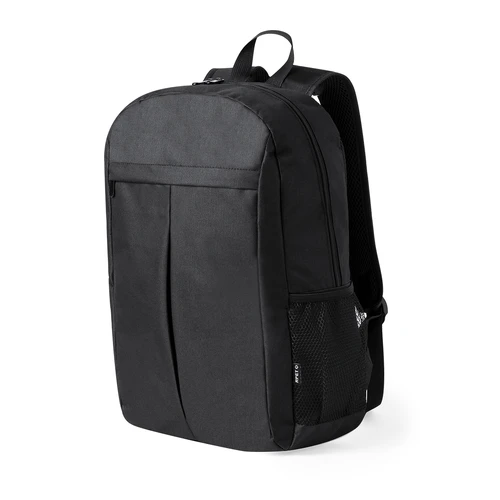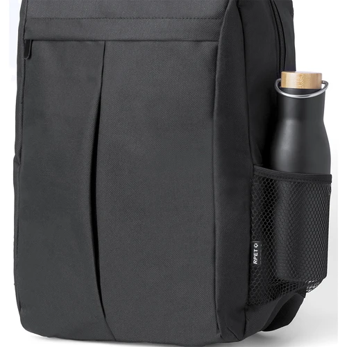 Mochila elaborada en resistente 600D RPET. Provista de cierre de cremallera de doble tirador y un práctico bolsillo frontal. Su interior cuenta con compartimentos acolchados diseñados para tablet de hasta 10 pulgadas y portátil de hasta 15 pulgadas. La espalda y las cintas de hombros están acolchadas y son ajustables, incorporando un tejido especial transpirable. Además, presenta una cinta superior y bolsillos laterales de rejilla. Logotipo RPET en etiqueta. Presentada en una bolsa individual reciclada. El material RPET se elabora a partir de plástico reciclado, para así fomentar la reutilización de residuos plásticos y ayudar a la sostenibilidad del planeta.