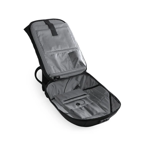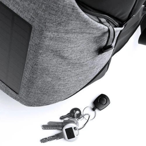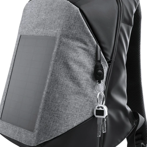 Mochila cargador con panel de carga solar en resistente poliéster 1200D. Resistente al agua, con salida USB para carga -powerbank no incluido- y cierre de seguridad con contraseña. Compartimento principal con doble tirador, con bolsillo acolchado para ordenador portátil de hasta 15 pulgadas y tablet de hasta 10 pulgadas. Cintas de hombros y espalda con acolchado ergonómico.