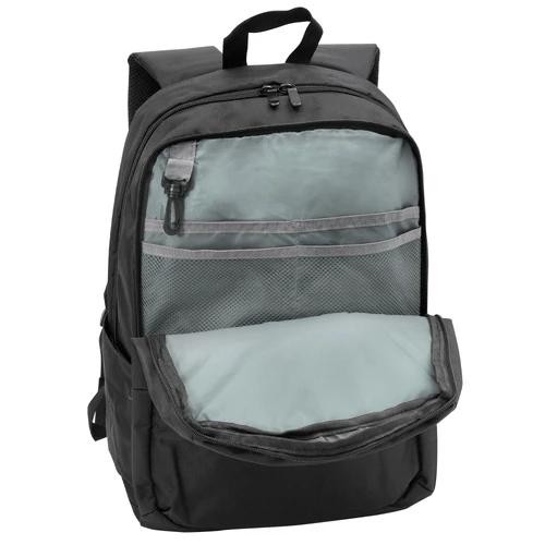 32 x 45 x 16 cm. Capacidad 25 litros. Poliéster 600D. Mochila Portanotebook de hasta 16". Bolsillo frontal con cierre y dos bolsillos laterales para botella o Mug. Dos compartimentos con cierre. Compartimento principal con bolsillo porta notebook y documentos. Compartimento intermedio con cuatro bolsillos pequeños y gancho plástico en su interior. Estructura, espalda y correas acolchadas. Tiradores de cierres metálicos en color negro.