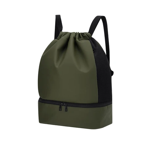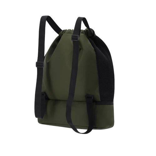 Mochila en suave PU con compartimento principal con cierre de cuerdas y pequeño bolsillo interior con cierre de cremallera. Incluye bolsillo en la base para zapatos con cierre de doble cremallera y bolsillos frontales con cierre de cremallera de rápido acceso. Con laterales transpirables y asas para los hombros ajustables.