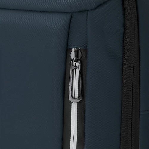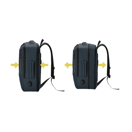 Mochila extensible confeccionada en resistente PU. Equipada con cierre de cremallera de doble tirador, con posibilidad para ampliar la capacidad. Con compartimento interior acolchado para portátil de hasta 15 pulgadas y tablet de hasta 10". En la parte frontal cuenta con tres bolsillos frontales y dos tiras reflectantes para mejor visibilidad. Cómodas cintas de hombros acolchadas, transpirables y ajustables, con posibilidad de cierre en hebilla. Incluye dos asas una en la parte superior y otra en el lateral junto con entrada USB. Incluye cinta para fijarla en trolley y maletas.