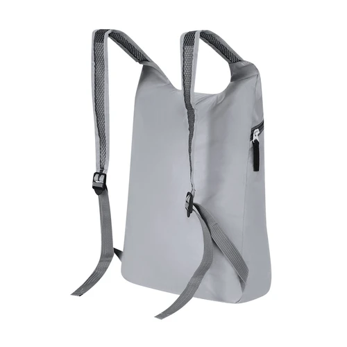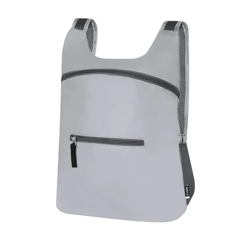 Mochila plegable de RPET. CFabricada empleando tejido con gran capacidad para reflejar intensamente la luz, gracias a millones de pigmentos reflectantes y basándose en el principio de la retro-reflexión de la luz, una propiedad de visibilidad nocturna que consiste en la refracción de la luz hacia la fuente de origen de la misma. Con cierre de cremallera y bolsillo frontal. Cintas de hombros regulables en material transpirable. Plegado de pequeño tamaño, con cinta de transporte. Incluye distintivo RPET.El material RPET se elabora a partir de plástico reciclado, para así fomentar la reutilización de residuos plásticos y ayudar a la sostenibilidad del planeta.
