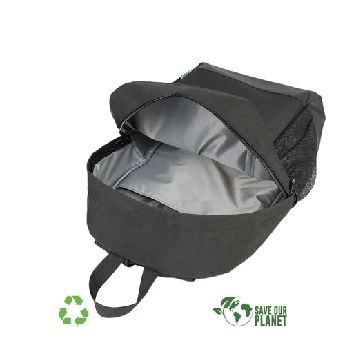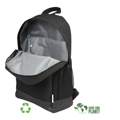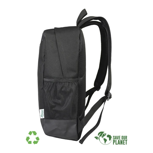 Mochila Porta-Notebook modelo "RPET". Fabricada en material reciclado RPET y poliéster 250D/PVC. Capacidad 20 litros, tamaño 29 x 48 x 14.5 cm. Incluye compartimento interior reforzado y acolchado para Laptop, bolsillo delantero y 2 bolsillos laterales con malla.