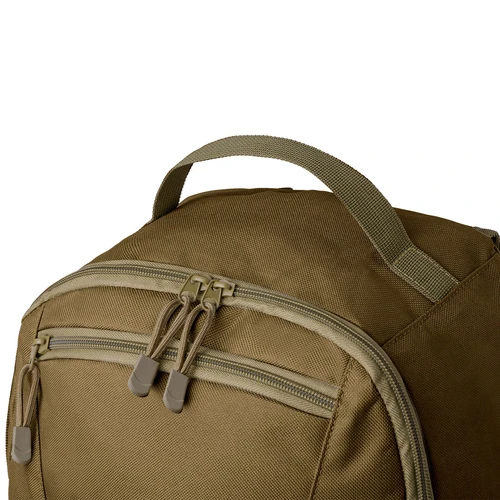 Mochila táctica en resistente poliéster 800D y en tonos marrón arena. Parte frontal con múltiples soportes elásticos para colgar los accesorios necesarios durante la aventura. Compartimento principal con cierre de cremallera de doble tirador y bolsillo. Incluye esquinas reforzadas, asa de transporte y bolsillos laterales de rejilla. Con espalda y cintas de hombros acolchadas y ajustables, presentada individualmente en bolsa reciclada.