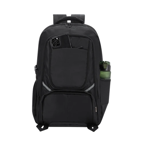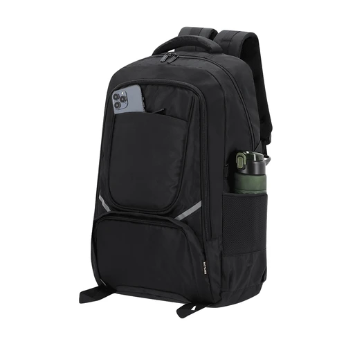Mochila fabricada en Nylon Reciclado 420D. Con bolsillo principal de cierre de cremallera con doble tirador. Bolsillos de malla laterales y cintas de hebilla ajustables Bolsillo interior para portátil de hasta 15 pulgadas. Incluye dos bolsillos frontales con cierre de cremallera y cintas reflectantes. Espalda y cintas acolchadas ajustables, con hebilla de cierre en el pecho para mayor sujeción.