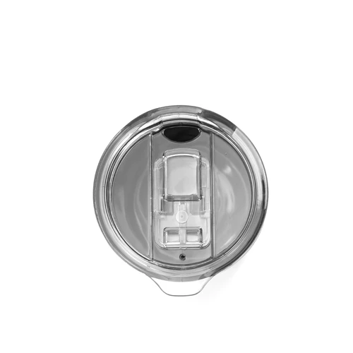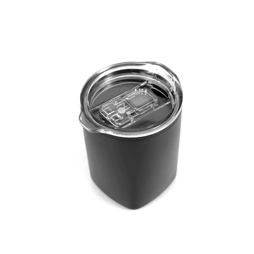 Mug térmico realizado en acero inoxidable en su exterior, y polipropileno de color negro en su interior, con tapa transparente cristal clear con cierre y base antideslizante.
