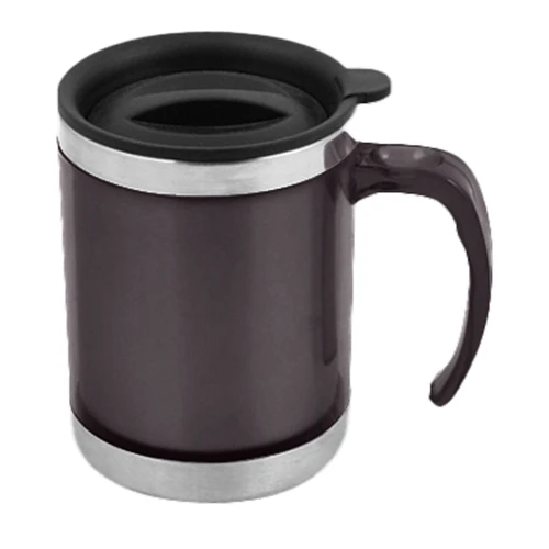 Mug térmico de doble pared aislante con tapa pull-up de PVC negro y dosificador. Base interior de Acero Inoxidable y pared exterior de PVC traslúcido.