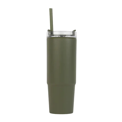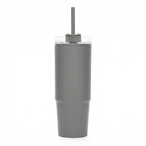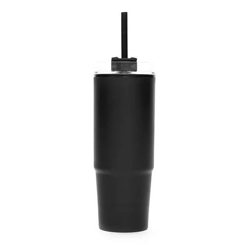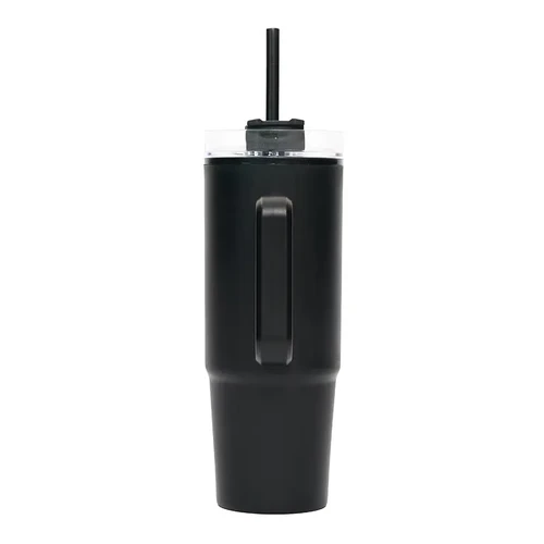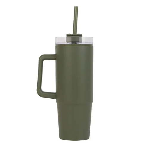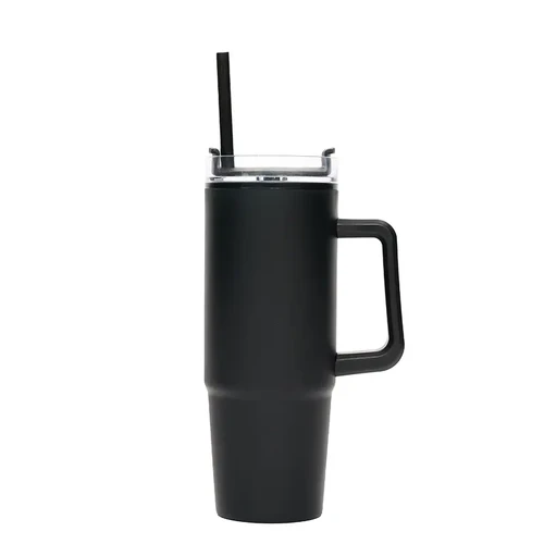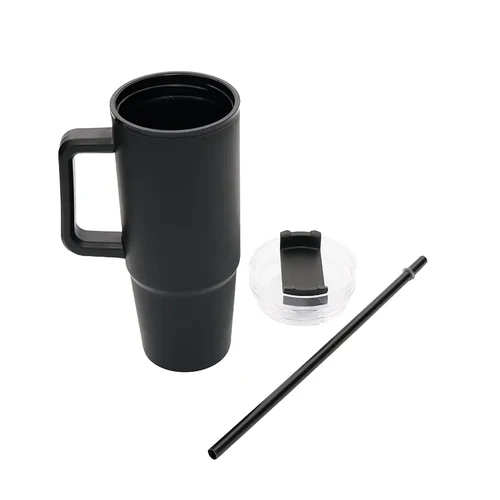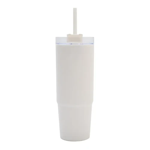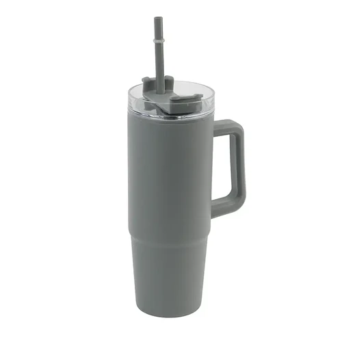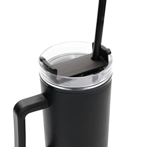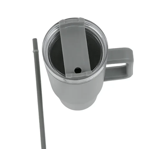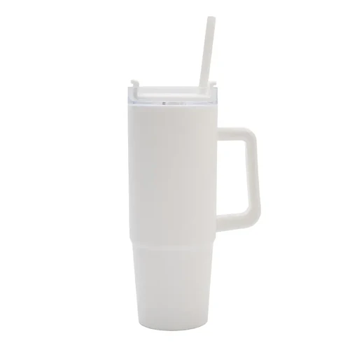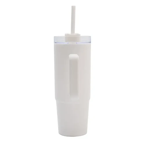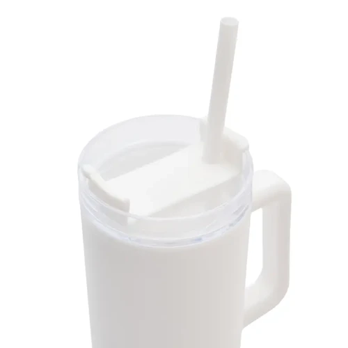Mug térmico con asa y sorbete integrado. Hecho de polipropileno (PP), AS y silicona con doble pared. Es ideal para mantener tus bebidas frías o calientes mientras te mueves durante el día.