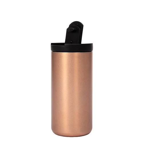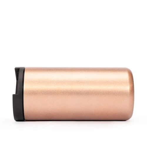 Mug metálico cilíndrico con doble pared aislante, interior Acero inoxidable 304 SS, exterior Acero inoxidable 201 SS, recubierto con pintura POWDER COAT color cobre. Producto BPA FREE, para el contacto con líquidos y alimentos. Fondo de silicona negra ABS anti-deslizante. Con tapa pull-up de plástico ABS negro y dosificador con sello cilíndrico de silicona. Capacidad 500ml. Presentación en bolsa compostable blanca + caja de regalo de cartón negro.