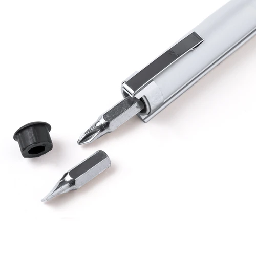 Práctica multiherramienta fabricada en aluminio, con nivel integrado en el cuerpo y dos cabezales para destornillador (plano y philips) en el interior. Con clip metálico de acabado cromado y presentada en caja de diseño kraft.