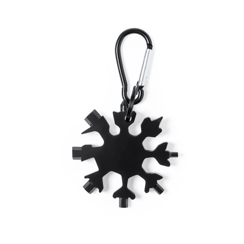Original y práctica multiherramienta fabricada en resistente acero inox de acabado negro, con anilla y mosquetón de transporte a juego. Con 17 funciones, entre otras, destornillador puntas planas y philips llaves hexagonales tipo allen cuchillo y abrebotellas. Presentada en caja individual negra.
