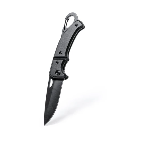Navaja con hoja en acero inox de acabado negro y resistente empuñadura a juego en aluminio. Con mosquetón integrado en mango y bloqueo de seguridad. Con troquelado en hoja para una fácil apertura y presentada en caja individual de diseño negra.