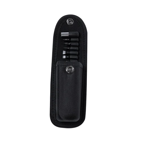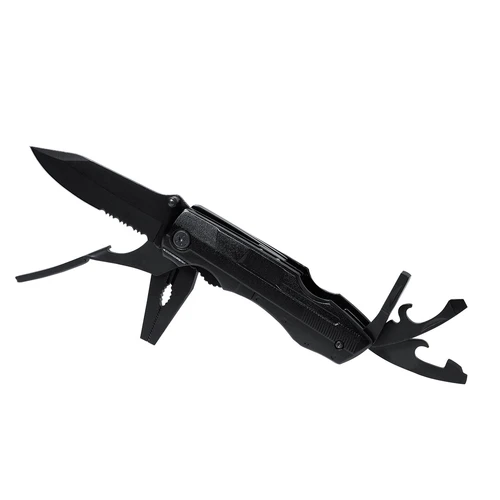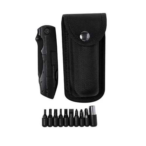 Navaja multiusos de acabado negro en acero inoxidable y resistente empuñadura a juego en aluminio. De diseño plegable y tamaño compacto. Incluye 10 funciones: - Destornillador con múltibles cabezales- Cuchillo de filo liso y dentado-Abrebotellas- Abrelatas- Alicates con cortador de hilosPresentada en práctico estuche de poliéster a juego con accesorio para cinturón.
