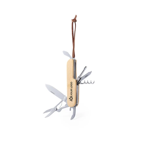 Navaja multiusos de línea nature, en combinación de materiales bambú y acero inox, con 9 funciones. Incluye navaja, abridores, tijeras, lima, destornillador, sacacorchos… Con cinta para transporte en polipiel y presentada en caja individual.