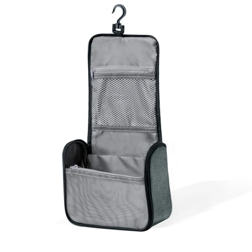 Neceser fabricado en RPET para guardar los objetos de higiene personal, con práctico gancho para poder sujetarlo en cualquier sitio. Práctico Interior con bolsillos de redecilla transpirables, que permiten ver los objetos que hay dentro. Con logotipo RPET en etiqueta. Disponible en varios colores y presentado en una bolsa individual reciclada. El material RPET se elabora a partir de plástico reciclado, para así fomentar la reutilización de residuos plásticos y ayudar a la sostenibilidad del planeta.