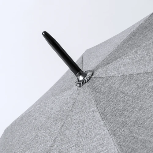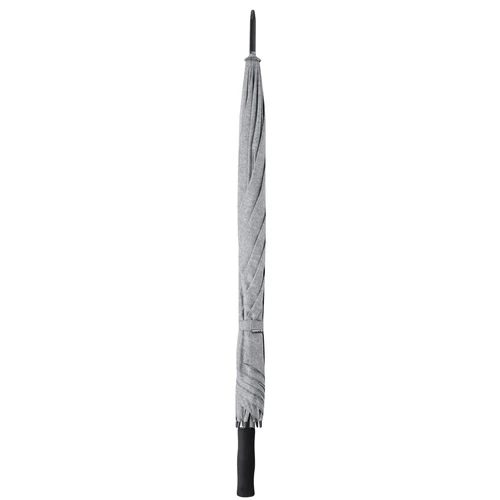 Paraguas de alta calidad y 130cm de diámetro, fabricado en material poliéster 150D y en elegante tono gris jaspeado. Apertura automática, varillas de fibra de vidrio antiviento y cierre de velcro. Mango recto fabricado en EVA. Presentado en bolsa reciclada.