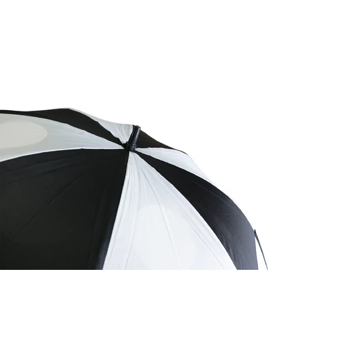 Paraguas de Golf de 8 paneles de sobrio diseño bicolor y 135cm de diámetro, de apertura manual. Fabricado en resistente material pongee, con sistema de seguridad antiviento. Varillas y eje de fibra en color negro, con cierre doble de velcro y suave mango a juego. Presentado en resistente funda del mismo material en color negro.