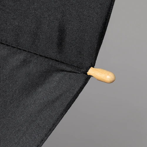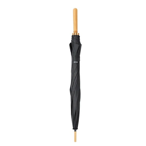 Paraguas de 140cm de diámetro en material pongee 190T RPET. Apertura manual y varillas de fibra de vidrio antiviento, de elegante color negro con cierre de velcro. Mango recto hecho en bambú y etiqueta distintiva RPET.El material RPET se elabora a partir de plástico reciclado, para así fomentar la reutilización de residuos plásticos y ayudar a la sostenibilidad del planeta.